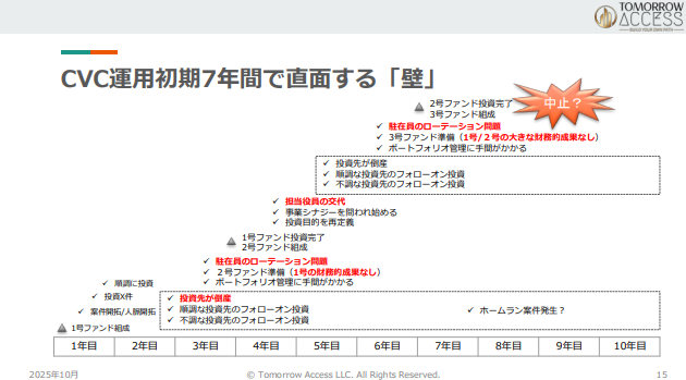 多くの企業では駐在員が3〜4年で交代するため、「前任者のネットワーク」「投資の文脈」「なぜこの企業に投資したか」が断絶しやすい。さらに、投資の成果がまだ出ていないため、新任の役員からは、「このCVCは何のためにあるのか?」「事業シナジーは本当に生まれているのか?」と根本的な問いが改めて投げられる時期になります。