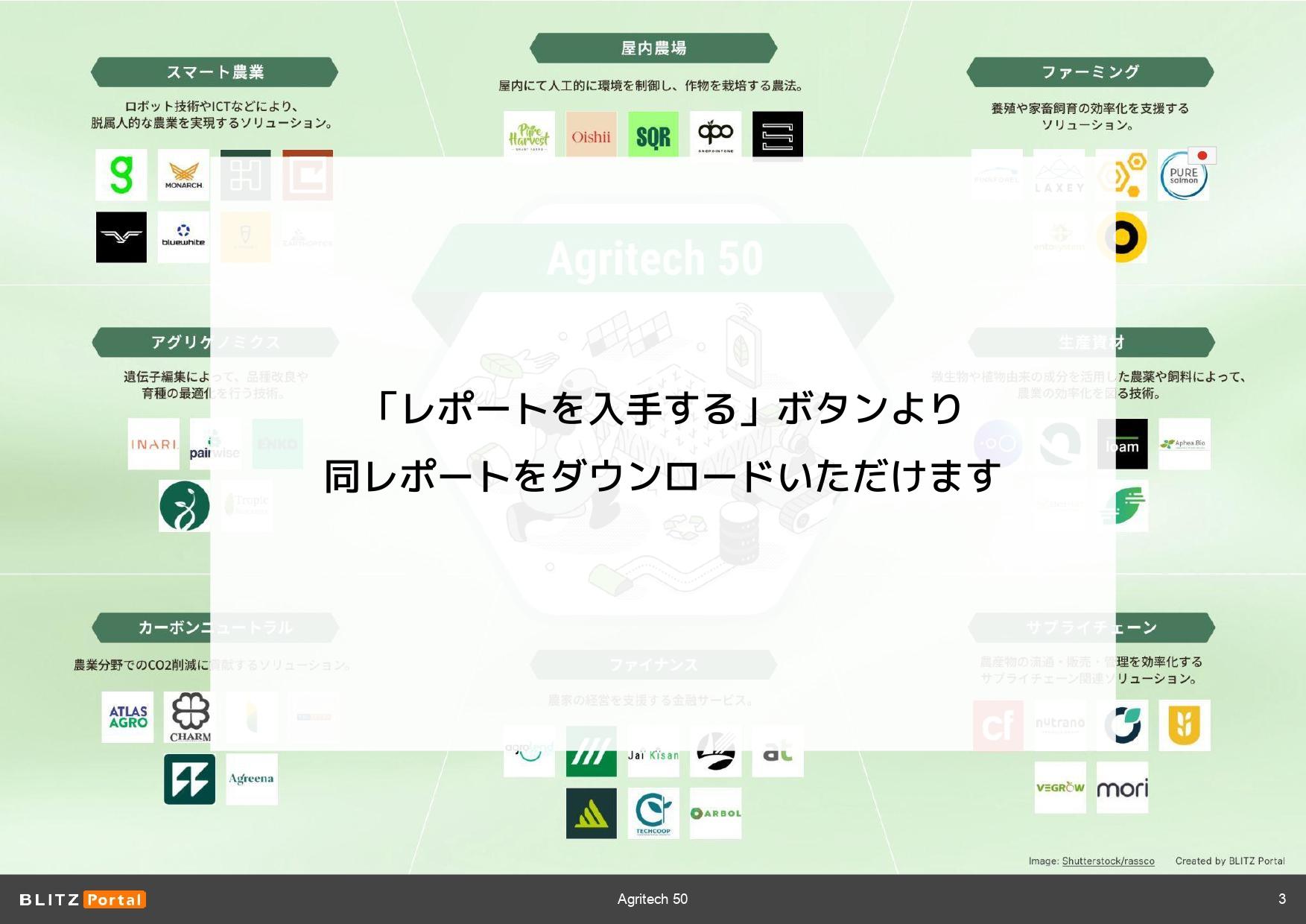 TECHBLITZ編集部では今回アグリテック(農業)関連の注目スタートアップや、その資金調達動向をまとめた「アグリテック 50」レポートを作成しました。“スマート農業”、“ファーミング”、“生産資材”などに分類し、スタートアップと世界の協業事例を紹介しています。