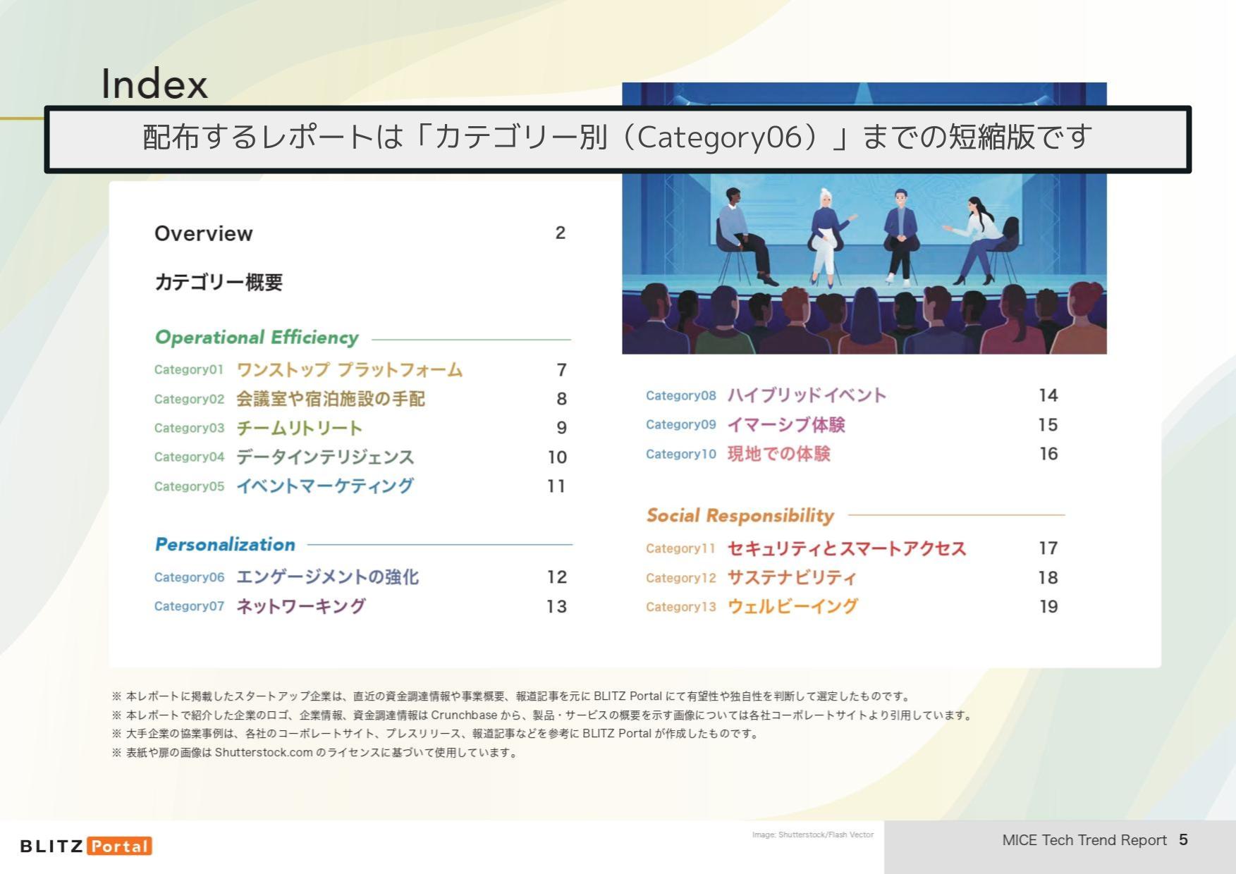 「MICEテックトレンドレポート」は、以下の画像の内容で構成しております。そのうち本記事のフォームから入手できる短縮版では、冒頭の「Overview」と「カテゴリー概要(一部)」をお読みいただけます。