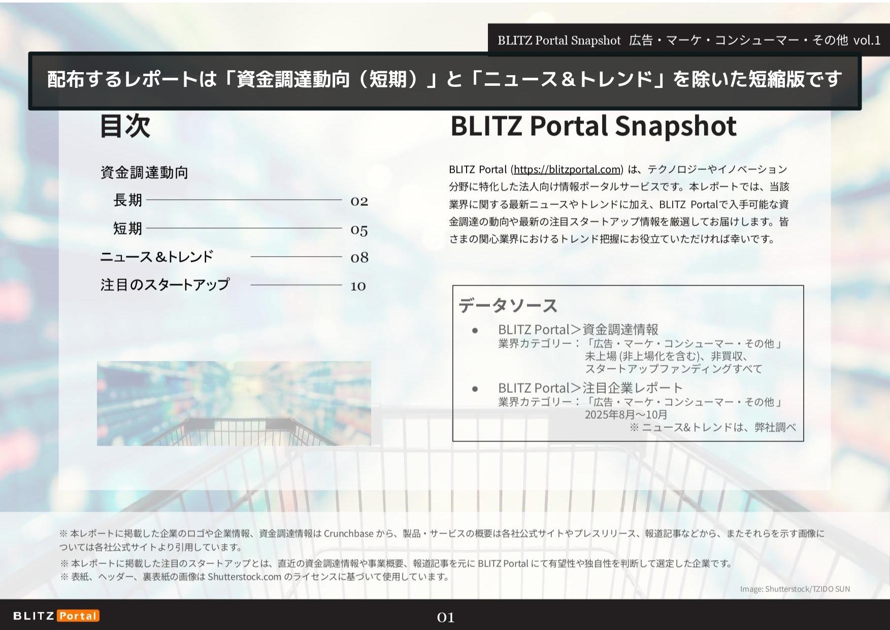 「BLITZ Portal Snapshot 広告・マーケ・コンシューマー・その他 vol.1」レポートは、以下画像の内容で構成しております。そのうち本記事のフォームから入手できる短縮版では、「資金調達動向(長期)」と「注目のスタートアップ」のセクションをご提供しています。 ※今回TECHBLITZ上で配布する「BLITZ Portal Snapshot 広告・マーケ・コンシューマー・その他 vol.1」レポートは一部項目のみの短縮版となります。下記コンテンツを含んだ完全版は「BLITZ Portal」会員のみに配布いたします。 [完全版で追加される内容] ・資金調達動向 短期 ・ニュース&トレンド
