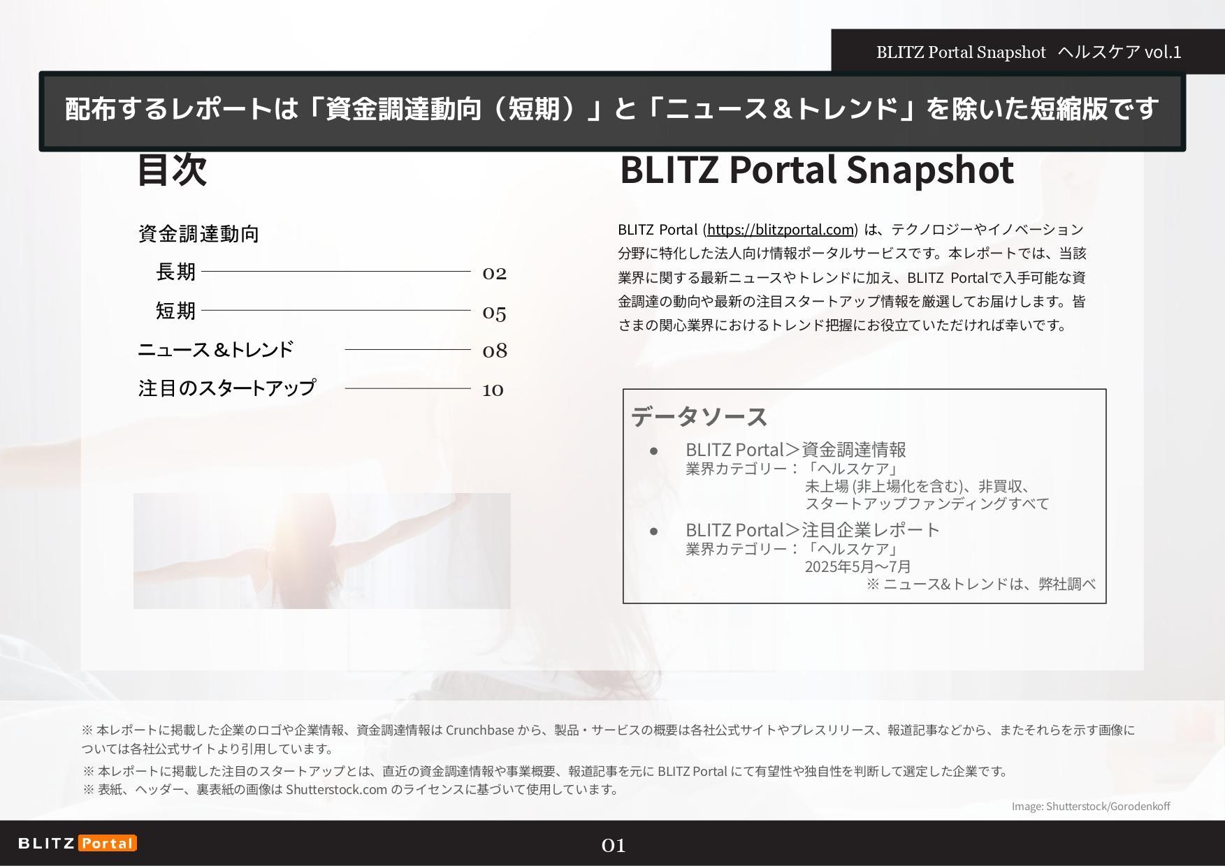 「BLITZ Portal Snapshot ヘルスケア vol.1」レポートは、以下画像の内容で構成しております。そのうち本記事のフォームから入手できる短縮版では、「資金調達動向(長期)」と「注目のスタートアップ」のセクションをご提供しています。 ※今回TECHBLITZ上で配布する「BLITZ Portal Snapshot ヘルスケア vol.1」レポートは一部項目のみの短縮版となります。下記コンテンツを含んだ完全版は「BLITZ Portal」会員のみに配布いたします。 [完全版で追加される内容] ・資金調達動向 短期 ・ニュース&トレンド
