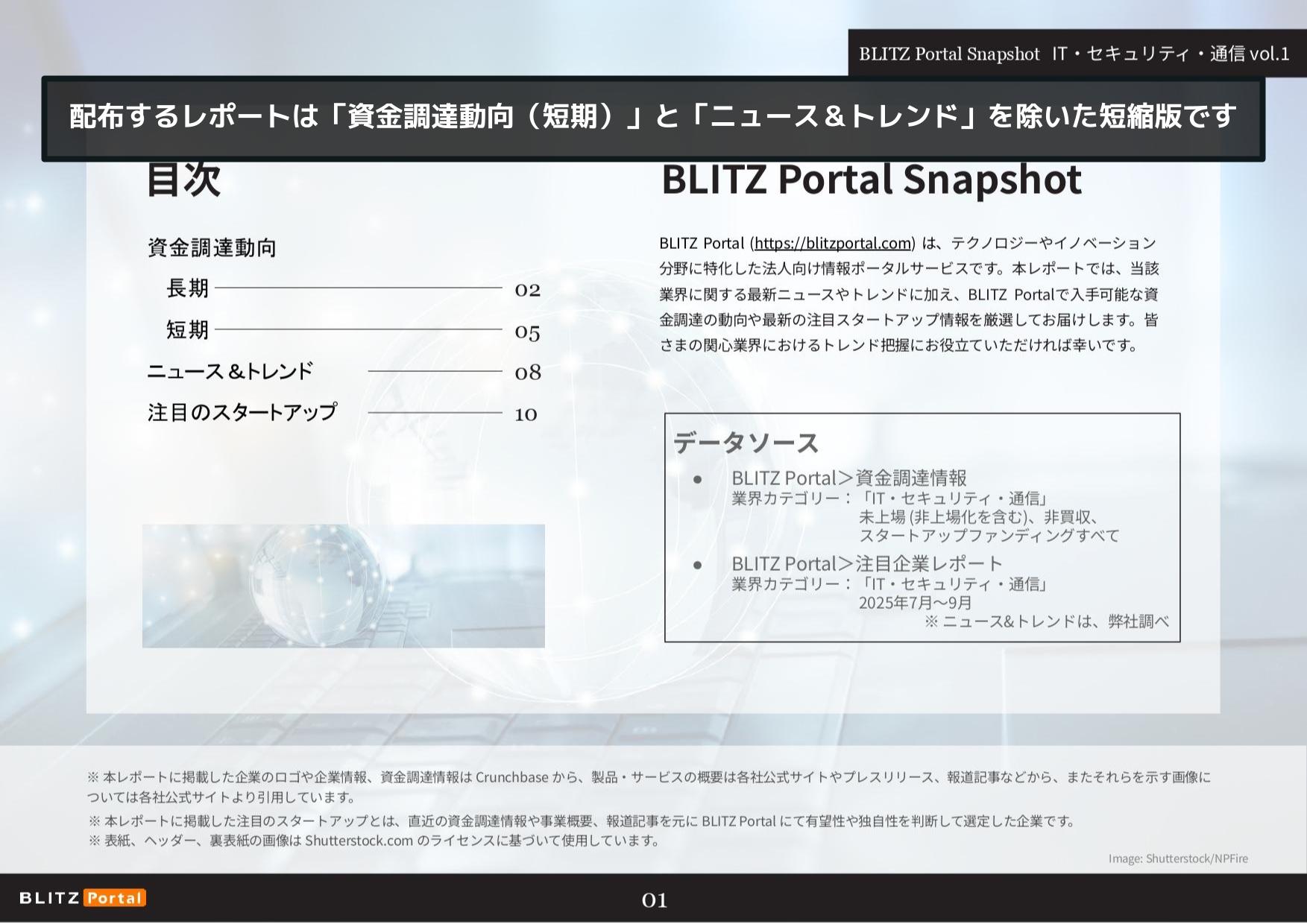 「BLITZ Portal Snapshot IT・セキュリティ・通信 vol.1」レポートは、以下画像の内容で構成しております。そのうち本記事のフォームから入手できる短縮版では、「資金調達動向(長期)」と「注目のスタートアップ」のセクションをご提供しています。 ※今回TECHBLITZ上で配布する「BLITZ Portal Snapshot IT・セキュリティ・通信 vol.1」レポートは一部項目のみの短縮版となります。下記コンテンツを含んだ完全版は「BLITZ Portal」会員のみに配布いたします。 [完全版で追加される内容] ・資金調達動向 短期 ・ニュース&トレンド