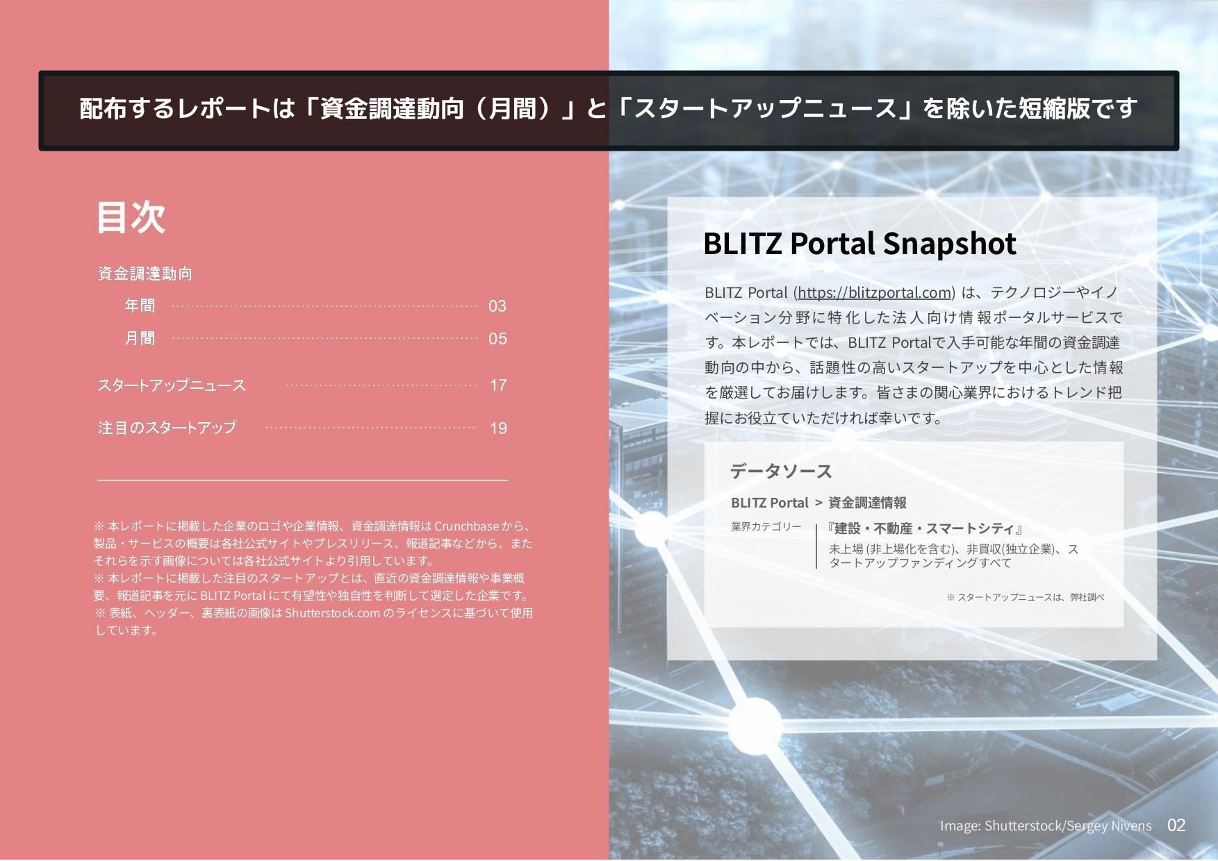 「BLITZ Portal Snapshot 建設・不動産・スマートシティ vol.1」レポートは、以下画像の内容で構成しております。そのうち本記事のフォームから入手できる短縮版では、「資金調達動向(年間)」と「注目のスタートアップ」のセクションをご提供しています。 ※今回TECHBLITZ上で配布する「BLITZ Portal Snapshot 建設・不動産・スマートシティ vol.1」レポートは一部項目のみの短縮版となります。下記コンテンツを含んだ完全版は「BLITZ Portal」会員のみに配布いたします。 [完全版で追加される内容] ・資金調達動向 月間 ・スタートアップニュース