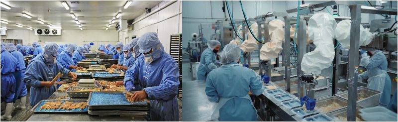 image : Chef Robotics 左「従来の人手作業による食品製造ライン」右「ロボット『Chef』搭載の自動化食品製造ライン」