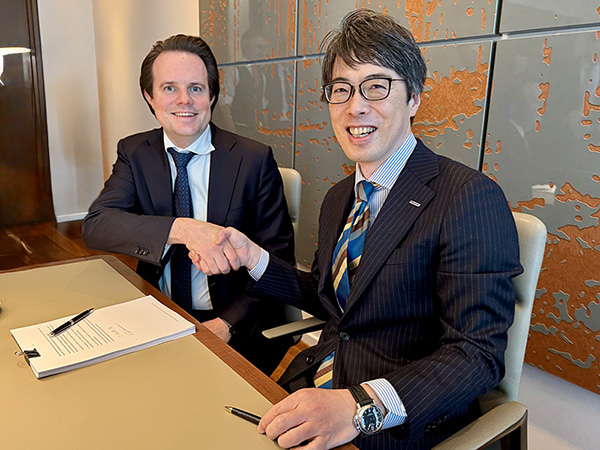 image : パナソニックホールディングス パナソニックとタドの契約締結の様子。パナソニック空質空調社副社長兼HVAC欧州事業部長の小松原宏氏㊨と、タドの共同創業者でCPOのクリスティアン・ダイルマン(Christian Deilmann)氏