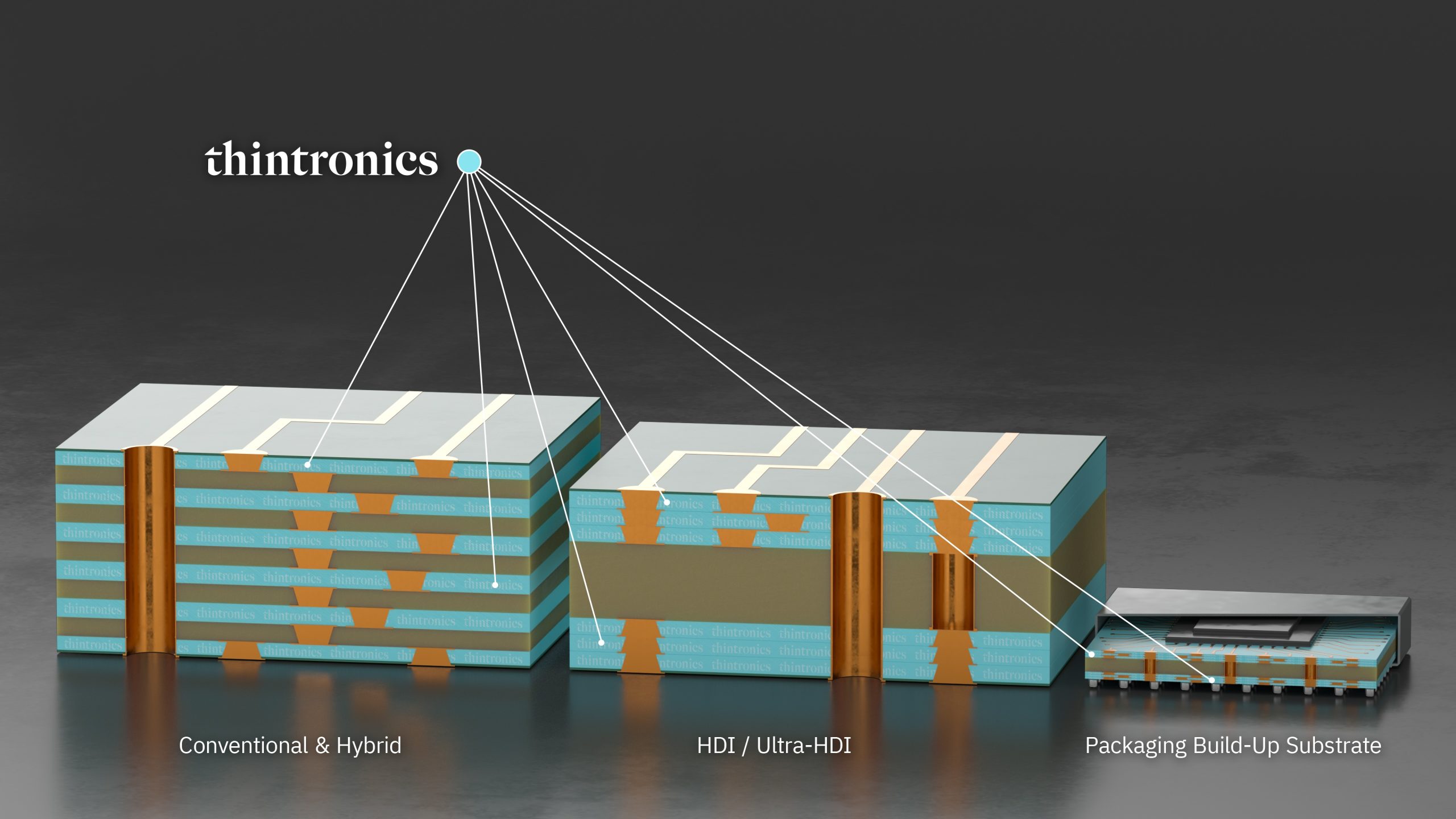 シリコンバレー発のThintronics(シントロニクス)は、この絶縁体に注目したスタートアップだ。これまでの電子機器は、脳に当たる「半導体チップ」、それを載せる「パッケージ基板」、さらにそれらを実装する「プリント基板(PCB)」など階層ごとにバラバラの絶縁材料が使われていたが、同社は独自の技術によってこれら1種類に統一するアプローチを採用し、「小さな積み重ね」による省電力化の実現を目指している。